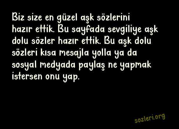 Biz size en güzel aşk sözlerini hazır ettik. Bu sayfada sevgiliye aşk dolu sözler hazır ettik. Bu aşk dolu sözleri kısa mesajla yolla ya da sosyal medyada paylaş ne yapmak istersen onu yap. ( Sevgiliye Aşk Dolu Sözler )