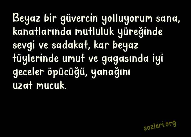 Beyaz bir güvercin yolluyorum sana, kanatlarında mutluluk yüreğinde sevgi ve sadakat, kar beyaz tüylerinde umut ve gagasında iyi geceler öpücüğü, yanağını uzat mucuk. ( Sevgiliye İyi Geceler )