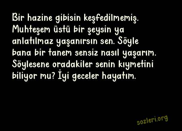 Bir hazine gibisin keşfedilmemiş. Muhteşem üstü bir şeysin ya anlatılmaz yaşanırsın sen. Söyle bana bir tanem sensiz nasıl yaşarım. Söylesene oradakiler senin kıymetini biliyor mu? İyi geceler hayatım. ( Uzaktaki Sevgiliye İyi Geceler )