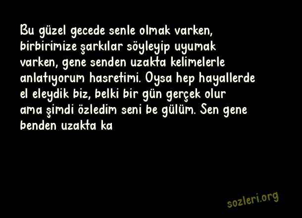 Bu güzel gecede senle olmak varken, birbirimize şarkılar söyleyip uyumak varken, gene senden uzakta kelimelerle anlatıyorum hasretimi. Oysa hep hayallerde el eleydik biz, belki bir gün gerçek olur ama şimdi özledim seni be gülüm. Sen gene benden uzakta ka ( Uzaktaki Sevgiliye İyi Geceler )
