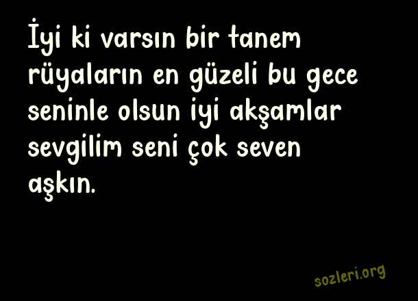 İyi ki varsın bir tanem rüyaların en güzeli bu gece seninle olsun iyi akşamlar sevgilim seni çok seven aşkın. ( Sevgiliye İyi Geceler )