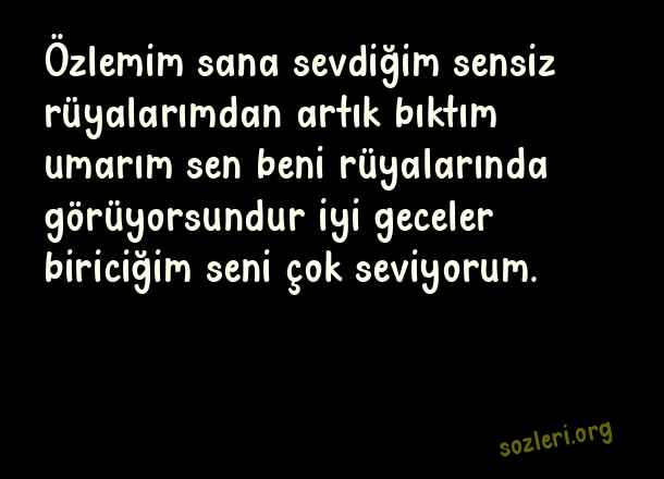Özlemim sana sevdiğim sensiz rüyalarımdan artık bıktım umarım sen beni rüyalarında görüyorsundur iyi geceler biriciğim seni çok seviyorum. ( Sevgiliye İyi Geceler )