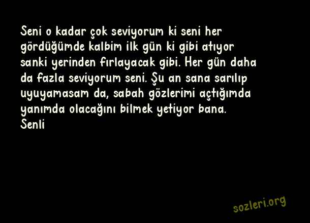 Seni o kadar çok seviyorum ki seni her gördüğümde kalbim ilk gün ki gibi atıyor sanki yerinden fırlayacak gibi. Her gün daha da fazla seviyorum seni. Şu an sana sarılıp uyuyamasam da, sabah gözlerimi açtığımda yanımda olacağını bilmek yetiyor bana. Senli ( Uzaktaki Sevgiliye İyi Geceler )