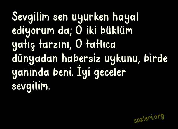 Sevgilim sen uyurken hayal ediyorum da; O iki büklüm yatış tarzını, O tatlıca dünyadan habersiz uykunu, birde yanında beni. İyi geceler sevgilim. ( Uzaktaki Sevgiliye İyi Geceler )