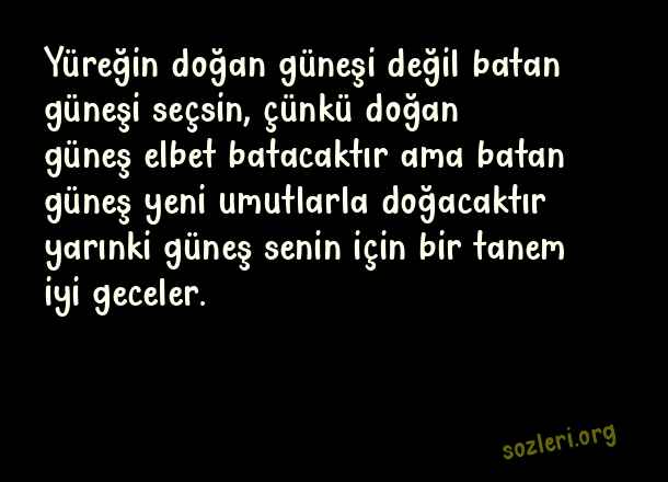 Yüreğin doğan güneşi değil batan güneşi seçsin, çünkü doğan güneş elbet batacaktır ama batan güneş yeni umutlarla doğacaktır yarınki güneş senin için bir tanem iyi geceler. ( Sevgiliye İyi Geceler )