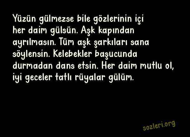 Yüzün gülmezse bile gözlerinin içi her daim gülsün. Aşk kapından ayrılmasın. Tüm aşk şarkıları sana söylensin. Kelebekler başucunda durmadan dans etsin. Her daim mutlu ol, iyi geceler tatlı rüyalar gülüm. ( Uzaktaki Sevgiliye İyi Geceler )