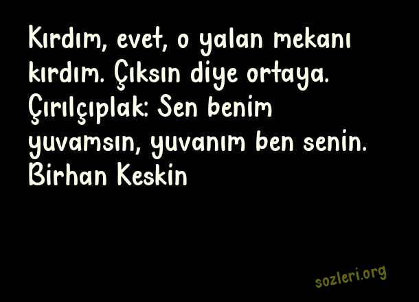 Kırdım, evet, o yalan mekanı kırdım. Çıksın diye ortaya. Çırılçıplak: Sen benim yuvamsın, yuvanım ben senin. Birhan Keskin ( Yuva )
