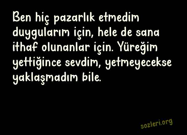 Ben hiç pazarlık etmedim duygularım için, hele de sana ithaf olunanlar için. Yüreğim yettiğince sevdim, yetmeyecekse yaklaşmadım bile. ( Sevgiliye Sevilene En Güzel Kısa Uzun Aşk )