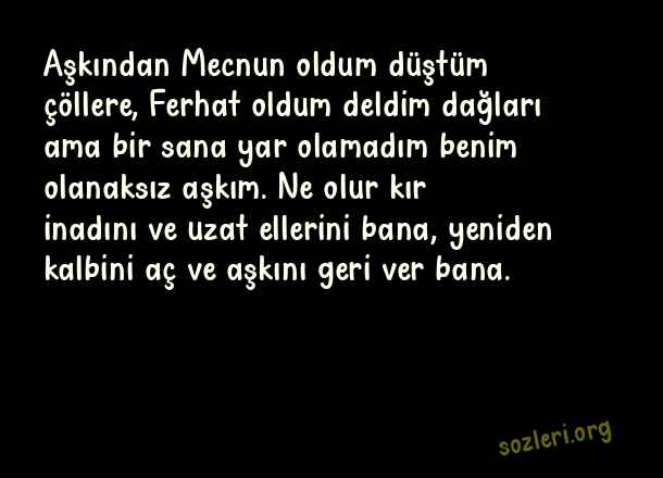 Aşkından Mecnun oldum düştüm çöllere, Ferhat oldum deldim dağları ama bir sana yar olamadım benim olanaksız aşkım. Ne olur kır inadını ve uzat ellerini bana, yeniden kalbini aç ve aşkını geri ver bana. ( Sevgiliye Uzun Sözler )
