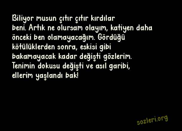 Biliyor musun çıtır çıtır kırdılar beni. Artık ne olursam olayım, katiyen daha önceki ben olamayacağım. Gördüğü kötülüklerden sonra, eskisi gibi bakamayacak kadar değişti gözlerim. Tenimin dokusu değişti ve asıl garibi, ellerim yaşlandı bak! ( Sevgiliye Uzun Sözler )