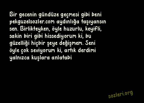 Bir gecenin gündüze geçmesi gibi beni aydınlığa taşıyansın sen. Birlikteyken, öyle huzurlu, keyifli, sakin biri gibi hissediyorum ki, bu güzelliği hiçbir şeye değişmem. Seni öyle çok seviyorum ki, artık derdimi yalnızca kuşlara anlatabi ( Sevgiliye Uzun Sözler )