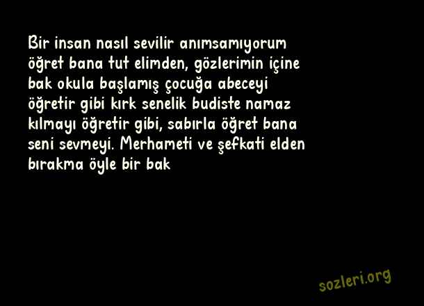 Bir insan nasıl sevilir anımsamıyorum öğret bana tut elimden, gözlerimin içine bak okula başlamış çocuğa abeceyi öğretir gibi kırk senelik budiste namaz kılmayı öğretir gibi, sabırla öğret bana seni sevmeyi. Merhameti ve şefkati elden bırakma öyle bir bak ( Sevgiliye Uzun Sözler )