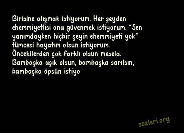 Birisine alışmak istiyorum. Her şeyden ehemmiyetlisi ona güvenmek istiyorum. “Sen yanımdayken hiçbir şeyin ehemmiyeti yok” tümcesi hayatım olsun istiyorum. Öncekilerden çok farklı olsun mesela. Bambaşka aşık olsun, bambaşka sarılsın, bambaşka öpsün istiyo ( Sevgiliye Uzun Sözler )
