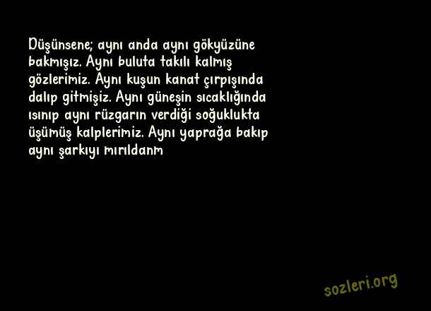 Düşünsene; aynı anda aynı gökyüzüne bakmışız. Aynı buluta takılı kalmış gözlerimiz. Aynı kuşun kanat çırpışında dalıp gitmişiz. Aynı güneşin sıcaklığında ısınıp aynı rüzgarın verdiği soğuklukta üşümüş kalplerimiz. Aynı yaprağa bakıp aynı şarkıyı mırıldanm ( Sevgiliye Uzun Sözler )
