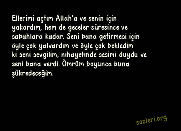 Ellerimi açtım Allah’a ve senin için yakardım, hem de geceler süresince ve sabahlara kadar. Seni bana getirmesi için öyle çok yalvardım ve öyle çok bekledim ki seni sevgilim, nihayetinde sesimi duydu ve seni bana verdi. Ömrüm boyunca buna şükredeceğim. ( Sevgiliye Uzun Sözler )