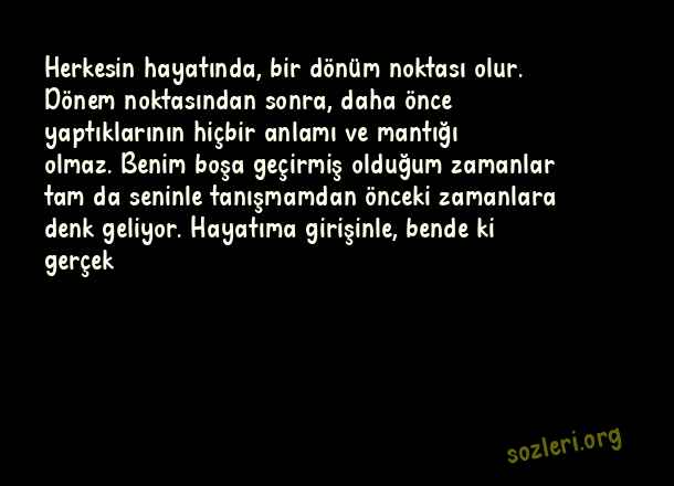 Herkesin hayatında, bir dönüm noktası olur. Dönem noktasından sonra, daha önce yaptıklarının hiçbir anlamı ve mantığı olmaz. Benim boşa geçirmiş olduğum zamanlar tam da seninle tanışmamdan önceki zamanlara denk geliyor. Hayatıma girişinle, bende ki gerçek ( Sevgiliye Uzun Sözler )