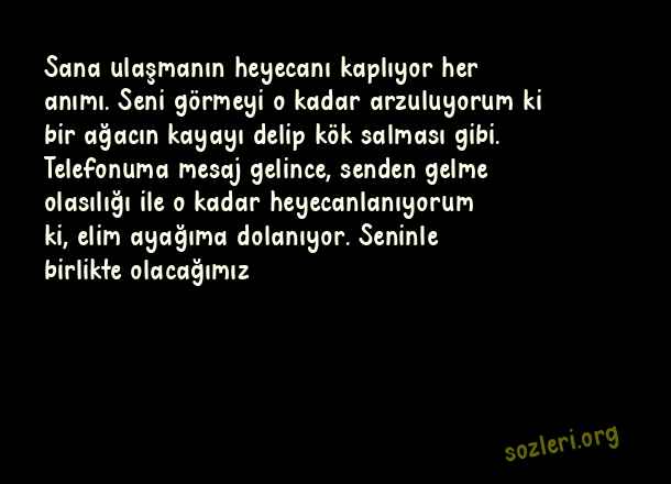Sana ulaşmanın heyecanı kaplıyor her anımı. Seni görmeyi o kadar arzuluyorum ki bir ağacın kayayı delip kök salması gibi. Telefonuma mesaj gelince, senden gelme olasılığı ile o kadar heyecanlanıyorum ki, elim ayağıma dolanıyor. Seninle birlikte olacağımız ( Sevgiliye Uzun Sözler )