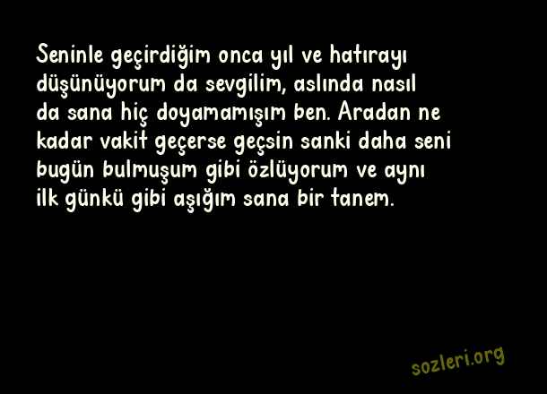 Seninle geçirdiğim onca yıl ve hatırayı düşünüyorum da sevgilim, aslında nasıl da sana hiç doyamamışım ben. Aradan ne kadar vakit geçerse geçsin sanki daha seni bugün bulmuşum gibi özlüyorum ve aynı ilk günkü gibi aşığım sana bir tanem. ( Sevgiliye Uzun Sözler )