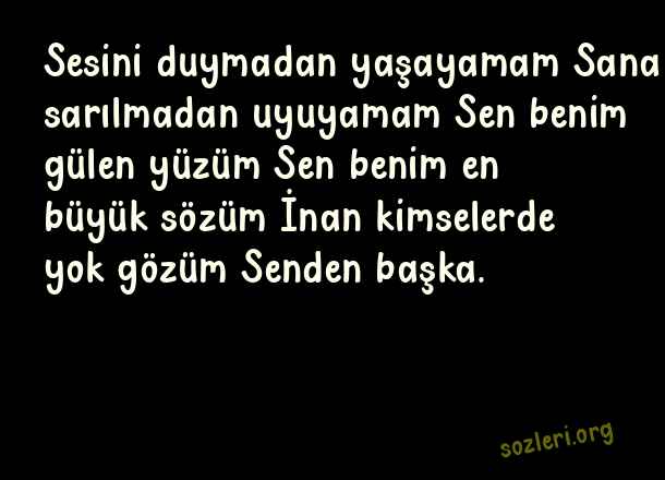Sesini duymadan yaşayamam Sana sarılmadan uyuyamam Sen benim gülen yüzüm Sen benim en büyük sözüm İnan kimselerde yok gözüm Senden başka. ( Sevgiliye Uzun Sözler )