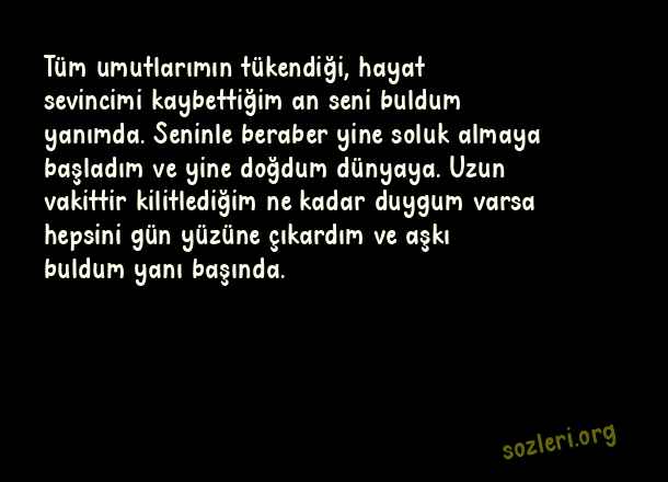 Tüm umutlarımın tükendiği, hayat sevincimi kaybettiğim an seni buldum yanımda. Seninle beraber yine soluk almaya başladım ve yine doğdum dünyaya. Uzun vakittir kilitlediğim ne kadar duygum varsa hepsini gün yüzüne çıkardım ve aşkı buldum yanı başında. ( Sevgiliye Uzun Sözler )