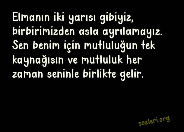 Elmanın iki yarısı gibiyiz, birbirimizden asla ayrılamayız. Sen benim için mutluluğun tek kaynağısın ve mutluluk her zaman seninle birlikte gelir. ( Sevgiliye Yazılacak Aşk )