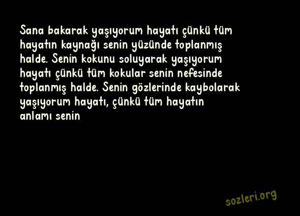 Sana bakarak yaşıyorum hayatı çünkü tüm hayatın kaynağı senin yüzünde toplanmış halde. Senin kokunu soluyarak yaşıyorum hayatı çünkü tüm kokular senin nefesinde toplanmış halde. Senin gözlerinde kaybolarak yaşıyorum hayatı, çünkü tüm hayatın anlamı senin ( Sevgiliye Yazılacak Aşk )