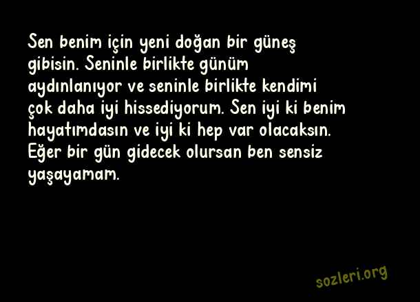 Sen benim için yeni doğan bir güneş gibisin. Seninle birlikte günüm aydınlanıyor ve seninle birlikte kendimi çok daha iyi hissediyorum. Sen iyi ki benim hayatımdasın ve iyi ki hep var olacaksın. Eğer bir gün gidecek olursan ben sensiz yaşayamam. ( Sevgiliye Yazılacak Aşk )