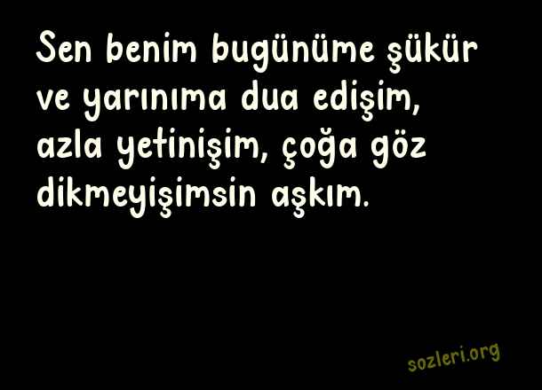 Sen benim bugünüme şükür ve yarınıma dua edişim, azla yetinişim, çoğa göz dikmeyişimsin aşkım. ( Sevgiliyle Fotoğrafın Altına Yazılacak Sözler )