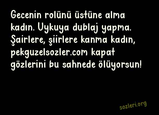 Gecenin rolünü üstüne alma kadın. Uykuya dublaj yapma. Şairlere, şiirlere kanma kadın, kapat gözlerini bu sahnede ölüyorsun! ( Şiirsel Sözler )