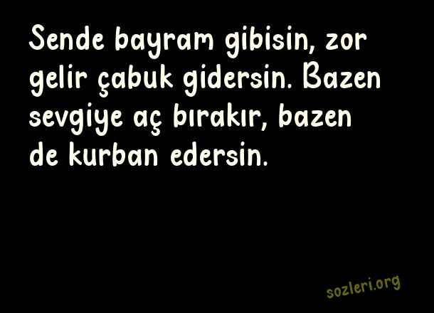 Sende bayram gibisin, zor gelir çabuk gidersin. Bazen sevgiye aç bırakır, bazen de kurban edersin. ( Şiirsel Sözler )