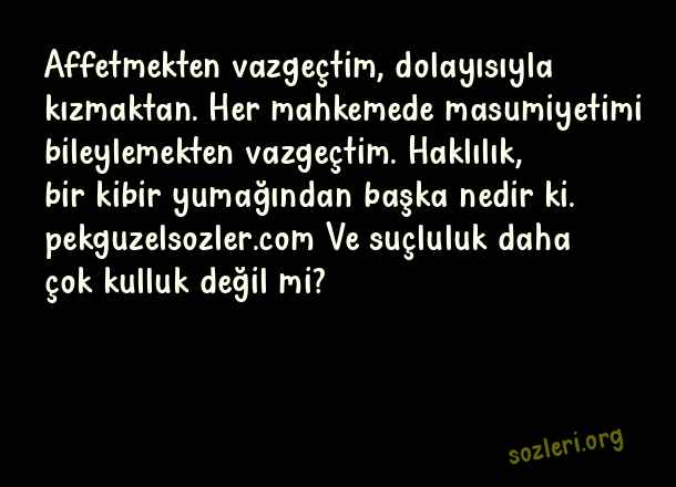 Affetmekten vazgeçtim, dolayısıyla kızmaktan. Her mahkemede masumiyetimi bileylemekten vazgeçtim. Haklılık, bir kibir yumağından başka nedir ki. Ve suçluluk daha çok kulluk değil mi? ( Sıradışı Aşk )