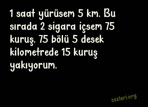 1 saat yürüsem 5 km. Bu sırada 2 sigara içsem 75 kuruş. 75 bölü 5 desek kilometrede 15 kuruş yakıyorum. ( Soğuk Espriler )