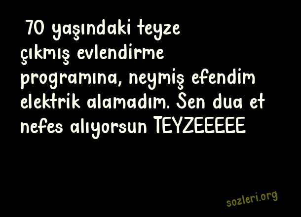 70 yaşındaki teyze çıkmış evlendirme programına, neymiş efendim elektrik alamadım. Sen dua et nefes alıyorsun TEYZEEEEE… ( Soğuk Espriler )