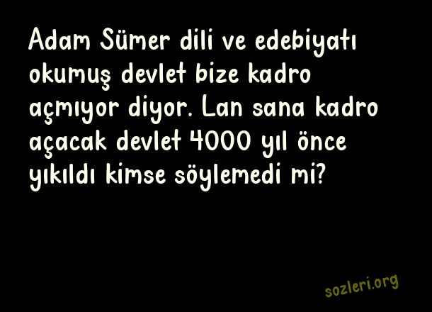 Adam Sümer dili ve edebiyatı okumuş devlet bize kadro açmıyor diyor. Lan sana kadro açacak devlet 4000 yıl önce yıkıldı kimse söylemedi mi? ( Soğuk Espriler )