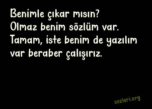 Benimle çıkar mısın? Olmaz benim sözlüm var. Tamam, iste benim de yazılım var beraber çalışırız. ( Soğuk Espriler )