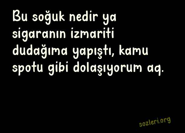 Bu soğuk nedir - Soğuk Espriler .. Bu soğuk nedir ya sigaranın izmariti dudağıma yapıştı, kamu spotu gibi dolaşıyorum aq. ( Soğuk Espriler )