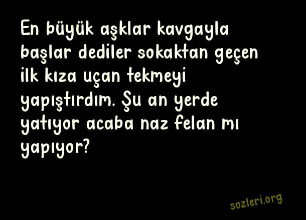 En büyük aşklar kavgayla başlar dediler sokaktan geçen ilk kıza uçan tekmeyi yapıştırdım. Şu an yerde yatıyor acaba naz felan mı yapıyor? ( Buz Kestiren Soğuk Espriler )