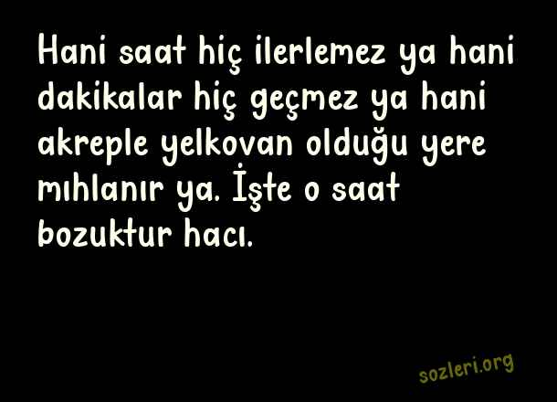 Hani saat hiç ilerlemez ya hani dakikalar hiç geçmez ya hani akreple yelkovan olduğu yere mıhlanır ya. İşte o saat bozuktur hacı. ( Soğuk Espriler )