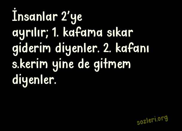 İnsanlar 2’ye ayrılır; 1. kafama sıkar giderim diyenler. 2. kafanı s.kerim yine de gitmem diyenler. ( Soğuk Espriler )
