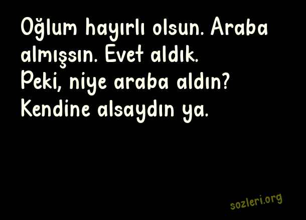 Oğlum hayırlı olsun. Araba almışsın. Evet aldık. Peki, niye araba aldın? Kendine alsaydın ya. ( Soğuk Espriler )