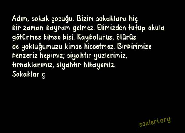 Adım, sokak çocuğu. Bizim sokaklara hiç bir zaman bayram gelmez. Elimizden tutup okula götürmez kimse bizi. Kayboluruz, ölürüz de yokluğumuzu kimse hissetmez. Birbirimize benzeriz hepimiz; siyahtır yüzlerimiz, tırnaklarımız, siyahtır hikayemiz. Sokaklar ç ( Sokak Çocukları )