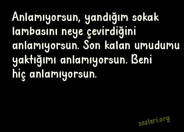 Anlamıyorsun, yandığım sokak lambasını neye çevirdiğini anlamıyorsun. Son kalan umudumu yaktığımı anlamıyorsun. Beni hiç anlamıyorsun. ( Sokak Lambası )