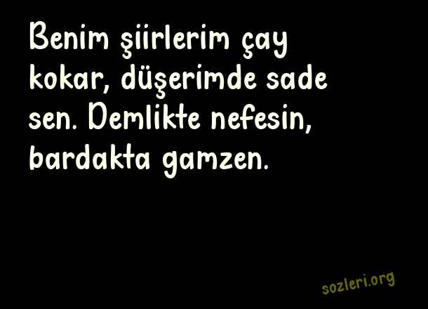 Benim şiirlerim çay kokar, düşerimde sade sen. Demlikte nefesin, bardakta gamzen. ( Şiir Sokakta )