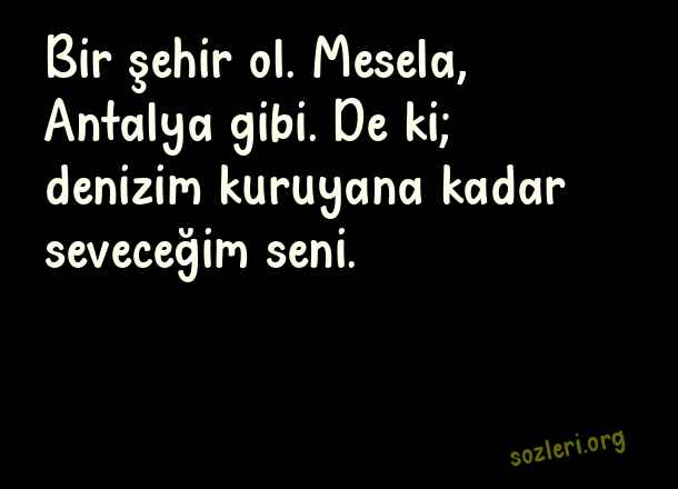 Bir şehir ol. - Şiir Sokakta Sözleri .. Bir şehir ol. Mesela, Antalya gibi. De ki; denizim kuruyana kadar seveceğim seni. ( Şiir Sokakta )