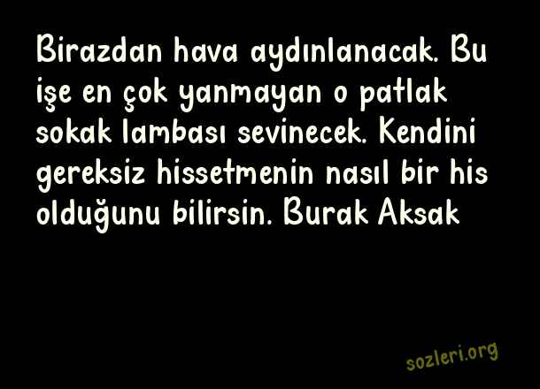 Birazdan hava aydınlanacak. Bu işe en çok yanmayan o patlak sokak lambası sevinecek. Kendini gereksiz hissetmenin nasıl bir his olduğunu bilirsin. Burak Aksak ( Sokak Lambası )