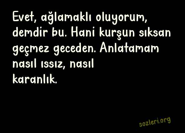 Evet, ağlamaklı oluyorum, demdir bu. Hani kurşun sıksan geçmez geceden. Anlatamam nasıl ıssız, nasıl karanlık. ( Şiir Sokakta )