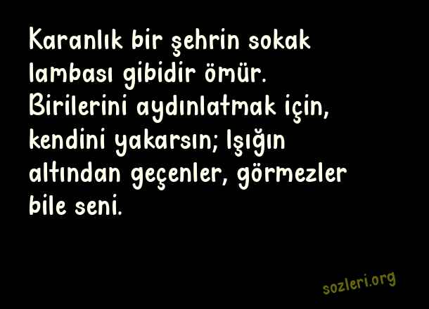 Karanlık bir şehrin sokak lambası gibidir ömür. Birilerini aydınlatmak için, kendini yakarsın; lşığın altından geçenler, görmezler bile seni. ( Sokak Lambası )