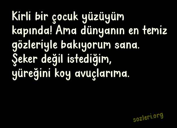 Kirli bir çocuk yüzüyüm kapında! Ama dünyanın en temiz gözleriyle bakıyorum sana. Şeker değil istediğim, yüreğini koy avuçlarıma. ( Sokak Çocukları )