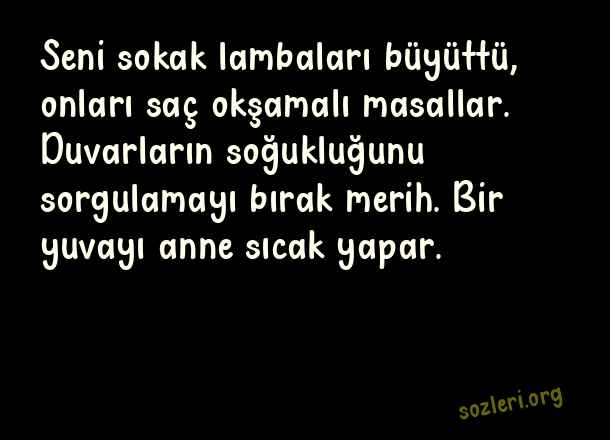 Seni sokak lambaları büyüttü, onları saç okşamalı masallar. Duvarların soğukluğunu sorgulamayı bırak merih. Bir yuvayı anne sıcak yapar. ( Sokak Lambası )