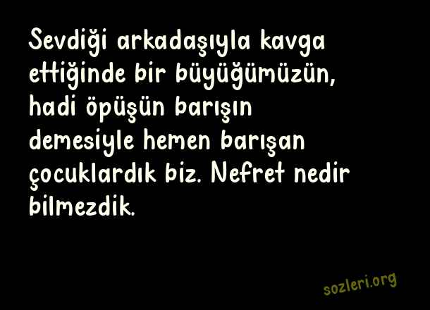 Sevdiği arkadaşıyla kavga ettiğinde bir büyüğümüzün, hadi öpüşün barışın demesiyle hemen barışan çocuklardık biz. Nefret nedir bilmezdik. ( Sokak Çocukları )